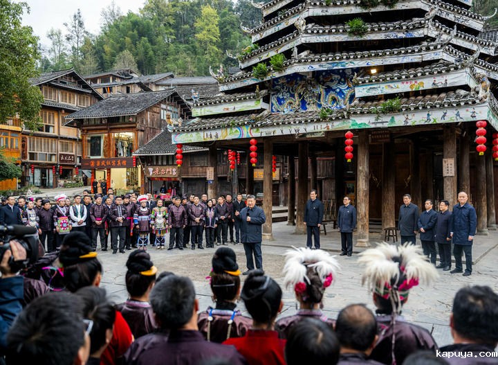 3月17日至18日,中共中央总书记、国家主席、中央军委主席习近平在贵州考察。这是17日下午,习近平在黔东南州黎平县肇兴侗寨考察时,身着民族盛装的村民在寨门口唱起侗族大歌欢迎总书记。新华社记者 谢环驰 摄